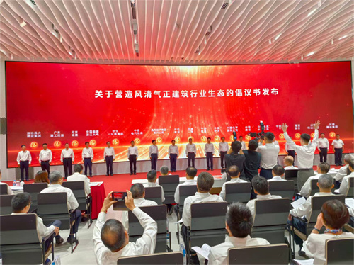 會(huì)議播放了建筑行業(yè)發(fā)展成果視頻《基石之力筑夢(mèng)中國(guó)式現(xiàn)代化》;中國(guó)建筑董事長(zhǎng)、黨組書記鄭學(xué)選進(jìn)行了主旨發(fā)言;倡議發(fā)起單位代表中鐵二局黨委副書記、總經(jīng)理張兵,中核集團(tuán)副總工程師、中國(guó)核建黨委書記、董事長(zhǎng)陳寶珠,上海建工集團(tuán)黨委副書記、工會(huì)主席殷紅霞,濰坊昌大建設(shè)集團(tuán)董事長(zhǎng)徐鵬強(qiáng)分別進(jìn)行了表態(tài)發(fā)言;中建一局黨委書記、董事長(zhǎng)左強(qiáng)代表建筑企業(yè)宣讀了倡議書,中建二局、中國(guó)核建、中機(jī)建設(shè)、中國(guó)中冶、通用技術(shù)集團(tuán)新興公司、中國(guó)化學(xué)國(guó)際公司、中鐵電氣化局、中鐵建設(shè)、中交一公局集團(tuán)、中國(guó)電建水電七局、中國(guó)能建浙江火電、中國(guó)安能一局、北京城建、隧道股份、廣東建工控股、山東科達(dá)集團(tuán)、濰坊昌大建設(shè)集團(tuán)、興泰建設(shè)集團(tuán)領(lǐng)導(dǎo),共同按壓大屏手印圖案,聯(lián)合發(fā)布了《關(guān)于號(hào)召建筑行業(yè)黨組織和廣大黨員在營(yíng)造風(fēng)清氣正行業(yè)環(huán)境中走在前作表率的倡議書》。